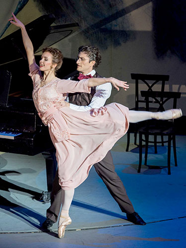 Im Trio Gerstl, Mathilde und Arnold Schönberg, ist Alexandru Tcacenco neu, aber noch etwas blass. Mathilde wird von Ionna Avraam getanzt. Sie macht besonders den Zwiespalt zwischen Geliebter und Ehefrau / Mutter deutlich. Begeisterter Zwischenapplaus war ihr sicher. Irina Tsymbal war Alma Mahler (Debüt in der vorangegangenen Vorstellung am 15. 2.). Ein Erlebnis. Selbstbewusst aber dem Meister fügsam, als Ehegattin, verführerisch, verführt und doch erschreckt und abgestoßen von der Wildheit dieses jungen Kerls (Oskar Kokoschka, erstklassig getanzt von Kirill Kourlaev), umgibt Tsymbal eine unnachahmliche Aura, die sie sowohl junges Mädchen wie reife Frau sein lässt. Neu besetzt sind auch die Rollen von Peter Altenberg (Attila Bakó) und Alexander Zemlinsky (Marcin Dempc). Ist die Rolle des Lehrers von Alma und zugleich Bruder von Mathilde Schönberg (der Reigen ist enger verflochten als zu sehen ist) nicht besonders differenziert, so hat Altenberg ein intensives Techtelmechtel mit dem süßen Mädel Mitzi, entzückend kokett und technisch einwandfrei (immer wieder) von Alice Firenze getanzt. Die erfahrene Tänzerin ist es, die im Pas de deux mit Bakó den Ton angibt.
