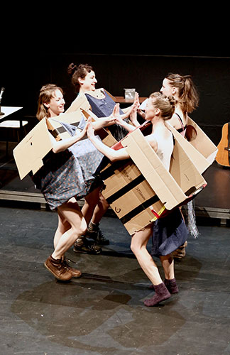 In ihrem „Fahndungsformat“ bemühen sich die Frauen, in Kartons mit angedeutetem Dirndlkleid (Waschdirndl, ohne Bluse) steckend, die Gründe für das Fortgehen von Schwester und Tante, Freundin und dem Josef zu finden. Bevor das neue Stück entstanden ist, haben sie in Stadt und Land recherchiert und Zitate gesammelt. Geschickt wechseln die Dirndln zwischen Eigenwerbung und Selbstdarstellung und ihren erdachten Figuren, die ganz offiziell mit Mikrophon sprechen. Nicht nur die Flucht aus der dörflichen Enge – einerseits Kontrolle, andererseits auch Wärme und Gemeinschaft – wird behandelt, auch das Leben im künstlerischen Kollektiv der Dirndln. Jede will die Beste, Einzige sein, jede giert nach Anerkennung. Damit sind sie weder in der Stadt noch auf dem Dorf allein. Es gilt, das Landei auf dem Scheitel zu tragen und die Balance zu halten. Nicht nur zwischen Stadt und Land. brut rabtaldirndln2 rania-moslam 6