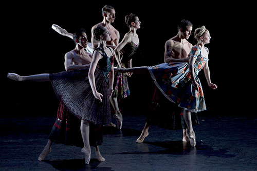 Ein seltsames Tanzstück ist Martin Schläpfer zu den aus einzelnen Tönen und stillen Momenten bestehenden Klangflächen Wilhelm Killmayers (Sinfonia I und II , entstanden1968) eingefallen. Langsam, fast unmerklich bewegen sich die TänzerInnen – vier Paare, die Männer mit nacktem Oberkörper in langen Röcken, die Frauen in dirndlartigen Kleidern mit bäuerlicher Zopfkrone. Die Zeit ist aufgehoben, es passiert kaum etwas, das steigert die Spannung. Puppenhaft steif und energielos tanzen die Frauen in der gedehnten Zeit auf Spitze. Sie werden gehoben und geschoben, keine Sekunde losgelassen. Endlich kommt etwas Bewegung in die dumpfe Aussichtslosigkeit Ein fünfter Mann taucht auf, ist ein Anderer, ein Fremder, stört die Symmetrie. Die beklemmende, fesselnde Magie dieser sonderbaren Rituals bleibt bestehen.