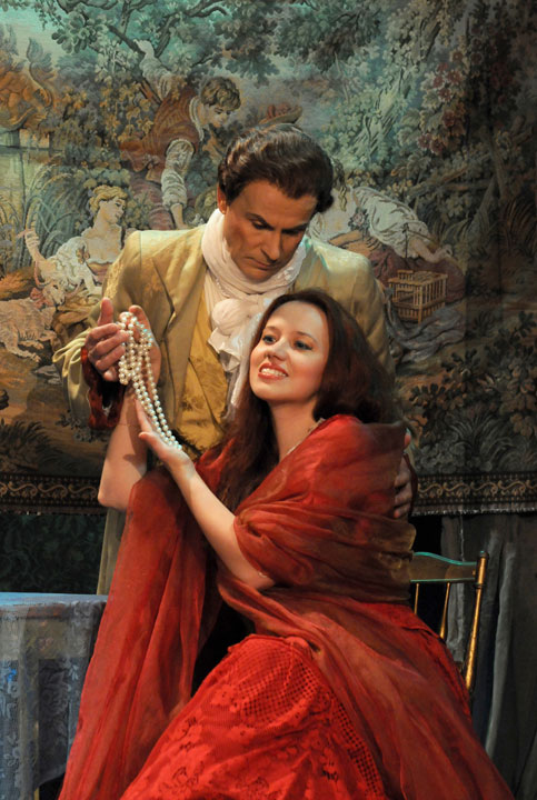 Der Liebesblitz trifft den mittellosen Theologiestudent des Grieux in Amiens. Dort hält die Postkutsche, in der sich Manon Lescaut in Begleitung ihres Bruders auf dem Weg ins Kloster befindet. Nun ist Amiens auch die Geburtsstadt von Emanuel Macron – ein unwiderstehlicher Aufhänger für die clever-witzige Conférence von Paul Müller im L.E.O. (der auch gesanglich in der Rolle des Lescaut überzeugt). Wie sich doch auch Amerika als einstige Strafkolonie mit dem heutigen Sittenbild der USA nur zu gut vergleichen lässt. Dorthin wird Manon nämlich strafversetzt, nachdem sie von ihrem betuchten Liebhaber M. Géronte der Prostitution bezichtigt worden war. Des Grieux in seiner amour fou begleitet seine Geliebte. In den Kolonien stirbt sie in seinen Armen. Puccini stellt Manon ins Zentrum des Geschehen, dementsprechend sind ihre Arien von einprägsamer Dramatik. (Im Gegensatz dazu thematisieren der Roman von Abbé Prévost ebenso wie das Ballett von Kenneth McMillan vor allen Dingen den Weg des Grieuxs, der in seinem Liebeswahn alle seine Vorstellungen von Anstand und Ehre über Bord wirft.)