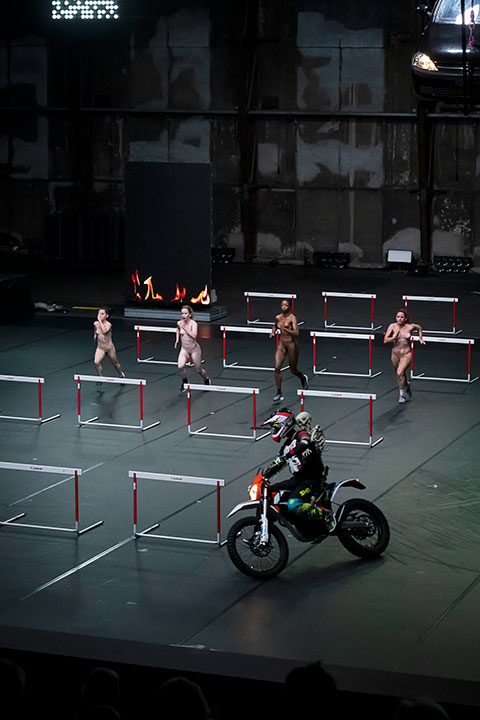 Bei Holzinger geht es immer auch sportlich zu, und diesmal hat sie sich dem Hürdenlauf verschrieben. Man läuft und springt, immer wieder aufs Neue. Derweilen fährt eine Gestalt mit der Motorcross-Maschine ständig dazwischen, das könnte Luzifer sein, Herr des Infernos. Zu den Sisyphos-Qualen, die Dante den Sündern auferlegt, gehört auch, Holz mit lauten Motorsägen zu zerkleinern. In diesem Sinn müssen auch zwei Frauen immer wieder von einer Freitreppe rollen.