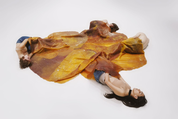 Sie hüllen sich in bedruckte Tücher. Die Wunden in diesen Landschaften sind die ihren. Und sie holen das oft nicht Wahrnehmbare in die Halle. Die wird zum Schmelztiegel räumlicher, regionaler und globaler Phänomene. Mit der Mythologie – Carla Rihl erzählt die Geschichte von Demeter und ihrer Tochter Kore (Persephone), während sie mit einem großen Klumpen Knete oder dessen Teilen figürlich experimentiert – bringen sie die Zeit sowie die Erfahrungen des Planeten ein in dieses Kontinuum von Wandel, Missbrauch und Zerstörung.