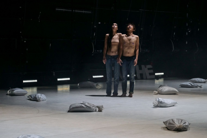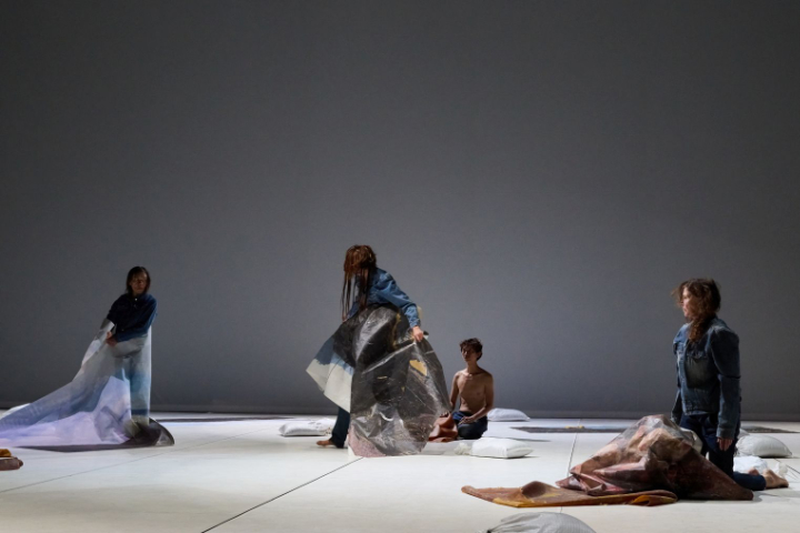 Die PerformerInnen Marcela San Pedro, Lena Schattenberg, Carla Rihl, Jianan Qu, Irwan Ahmett und Claudia Bosse selbst, von ihr stammen Choreografie, Texte, Raum und Objekte, bevölkern in Jeans und oben leicht bis unbekleidet eine Bühne, die als begehbar installiert, vom Publikum jedoch nur am Rand auf mit Erde gefüllten Säcken sitzend belebt wurde. In der Mitte liegen braune, schwere Latex-Folien.