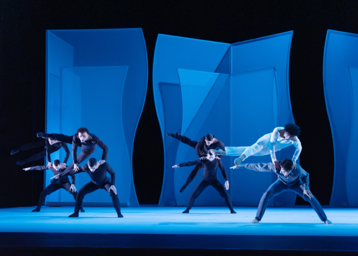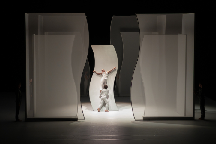 Das erste – „Les Noces“ von Jean-Christophe Maillot zu Igor Strawinskys gleichnamiger Musik in einer Aufnahme der Pariser Oper unter Pierre Boulez von 1965 – fegt zu Gesang und Orchester in klarster, perfekt kontrollierter Schritttechnik wie ein geometrieverliebter Orkan am Auge des Betrachters vorbei. Die Übernahme ins Repertoire bot sich an, weil Maillot – wie sonst kaum – auf den Einsatz von Spitzenschuhen verzichtet. Schon nach 25 Minuten verlischt das Licht wieder über dem Brautpaar. Die geschwungenen, hell-durchscheinenden und anfangs im Hintergrund aufragenden Wandelemente werden zu Raumecken, die Lisa Van Cauwenbergh (Tochter/Braut) und Luca Branca (Sohn/Bräutigam) auf ihrem steil gen Himmel ragenden Hochzeitsbett zuletzt immer enger umschließen.