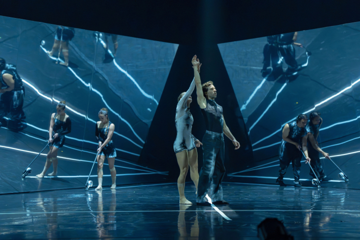 Und so ist auf der Bühne im Nürnberger Opernhaus einmal mehr ein Kraftwerk an inhaltlichen Visionen, narrativer Emotionalität, hintergründig andersartigen Sichtweisen auf bekannte Vorlagen, choreografisch eine Menge an Assoziationen freisetzenden Einfällen und dynamischen Bewegungsevolutionen von Soloparts über Duette bis hin zu fantastisch fließend ausgearbeiteten Gruppenformationen zu erleben: expressiv, aufwühlend, berührend schön und in der Verquickung mit zwei mobilen, den Raumeindruck gewaltig verändernden Spiegelwänden theatralisch unheimlich effektvoll. Durch den Einsatz der liegenden rechteckigen Spiegelflächen (Bühne: Leticia Gañán & Curt Allen Wilmer) als quasi sichtbarmachendes Symbol für die im Kopf der Interpreten – beziehungsweise eines Interpreten – stattfindenden psychischen Veränderungen bringt Montero auf ziemlich einfache Weise eine weitere wichtige Ebene ein.