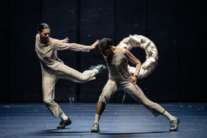 Ganz anders der Einstieg in den Abend mit “Aerea” von Alessandra Corti. Hier liefert Michael Gordon mit “Rewriting Beethoven’s Seventh Symphony” den musikalischen Rahmen, doch nicht nur. Tainá Ferreira Luiz singt – durchaus berührend – “Wild is the Wind” nach Cat Power und verankert das Stück damit in einer Art Nachtclub-Atmosphäre. Diese wird durch köperbetonte Moves sowie glamouröse gender-übergreifende Kostüme von Lucia Vonrhein unterstützt – Andeutungen, die das Geschehen im Identitätsthema verorten, das die zeitgenössiche Performance schon seit längerer Zeit dominiert. Den Titel “Aerea”, so die Italienerin, hat sie gewählt, weil es ein Palindrom ist, das sich von vorne und hinten lesen lässt. Das mag erklären, dass keine choreografische Richtung erkennbar ist. Der bedingungslose Einsatz der Tänzer*innen eröffnet interessante Momente, die sich jedoch in einer allgemeinen Beliebigkeit verlieren.
