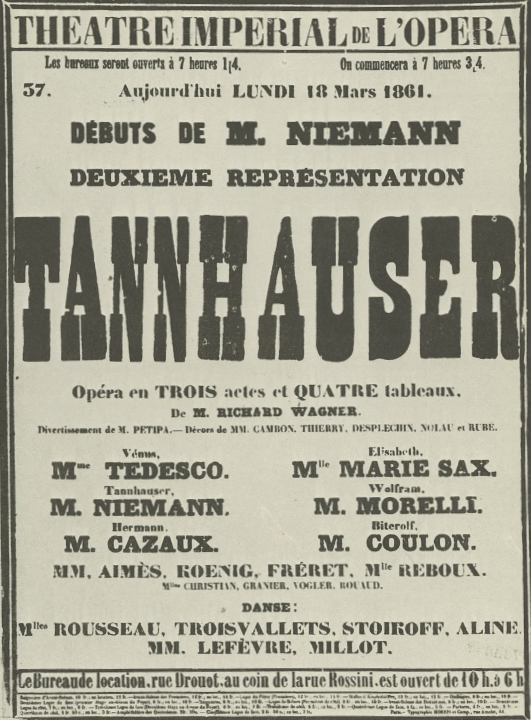 14 Wagner webDie zweite Vorstellung am 18. März 1861 war wegen einer Unpässlichkeit des Sängers der Titelrolle, Albert Niemann, verschoben worden. Offenbar waren erst jetzt vermehrt Abonnenten und Mitglieder des Jockey Club im Publikum. Eine Tochter von Franz Liszt, Blandine, teilt ihrem Vater brieflich die Ereignisse dieser Vorstellung mit. „Alles ging gut bis in die Mitte des II. Akts. Der Kaiser trifft mit der Kaiserin ein. Die Sänger bleiben gespannt und sind elektrisiert: Mlle Sax [Elisabeth] spricht [sic] ihre Rolle stark, es gibt warmen Applaus. Da kommt ein Pfiff vom Rang, Bravos, Pfiffe. ,Hinaus mit der Kabale‘ schreit einer, und der Saal erhebt sich, um gegen den Pfeifenden zu protestieren. Großer Lärm, der Kaiser streicht seinen Bart, lächelt und hebt die Hände zum Klatschen, die Kaiserin schaut indigniert. Der II. Akt endet, und man applaudiert erneut. Im III. wird Morelli [Wolfram] sehr bewundert, Niemann, dem grässlichen Niemann, wird applaudiert bei jeder Pause seiner Arie; man pfeift, Bravos und erneut Pfiffe. Aber nun verdoppeln sich die Bravos, Niemann bedankt sich beim Publikum. Der Kampf dauert also bis zum Schluss.“
