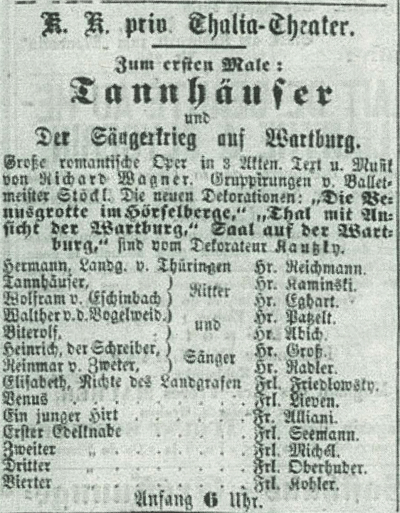 18 Wagner webSelbstverständlich war „Tannhäuser“ in Österreich davor schon längst auf den Spielplänen verschiedenster Theater gestanden. Die allererste Begegnung mit dem Werk fand am 2. Jänner 1854 im Wiener Sophienbadsaal durch die Aufführung der Ouvertüre in einer „Concert-Soirée“ des aus diesem Anlass auf 54 Mitglieder verstärkten Orchesters des „Herrn Capellmeister Strauß“ statt. Drei Wochen nach diesem „Auftakt“ durch Johann Strauß Sohn gelangte am 20. Jänner 1854 die gesamte Oper am Ständischen Theater in Graz zur österreichischen Erstaufführung (für die „Gruppierungen“ war Ballettmeister Leonhard Hasenhut zuständig). Erst dreieinhalb Jahre später, am 28. August 1857, erfolgte die Wiener Erstaufführung des „Tannhäuser“ im Thalia-Theater (Gruppierungen: Ballettmeister Franz Xaver Stöckl), noch im selben Jahr wurde das Werk im Theater in der Josefstadt gegeben. Dass Johann Nestroy als ausgebildeter Opernsänger ein besonderes Interesse an der Novität hatte, versteht sich von selbst. „Tannhäuser. Zukunftsposse mit vergangener Musik und gegenwärtigen Gruppierungen in drei Aufzügen“ lautete der provokante Titel seiner Parodie des Werks (Musik: Carl Binder, Carl-Theater 1857). 19 Wagner web