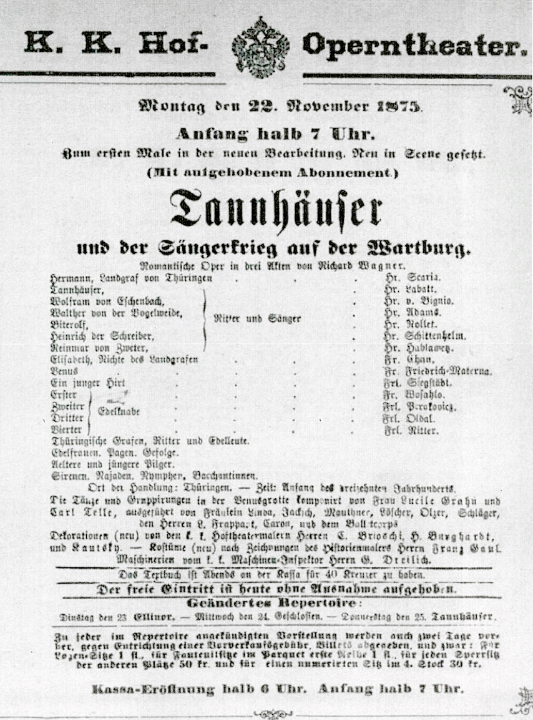 Auch die Hofoper hatte „Tannhäuser“ bereits zur Aufführung gebracht: 1859 war die Oper am Kärntnertortheater herausgekommen, 1870 folgte die Übernahme in das Haus am Ring, 1875 schließlich kam die schon festgehaltene Aufführung zustande. Hans Richter dirigierte, für die Choreografie war neben Grahn auch Carl Telle verantwortlich. Solistisch tanzten die Damen Bertha Linda, Amalie Jaksch, Henriette Mauthner, Leopoldine Löscher, Marie Olzer und Hedwig Schläger sowie die Herren Léon Frappart und Alfred Caron. Linda war in diesen Tagen vielbeschäftigt. Nicht nur tanzte sie am Tag nach dem „Tannhäuser“ die Titelrolle in Paul Taglionis „Ellinor“, sondern war am Tag vor der Premiere der Wiener Fassung der Wagner-Oper auch als Äbtissin Helene in „Robert der Teufel“ zu sehen! Damit konnte nicht nur das Publikum die beiden Tanzszenen gut miteinander vergleichen, Meyerbeer war ihm wiederum – so mochte Wagner denken –, wie schon 1861 in Paris, wo die 500. Vorstellung von „Robert“ gegeben worden war, nahegerückt.