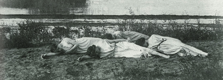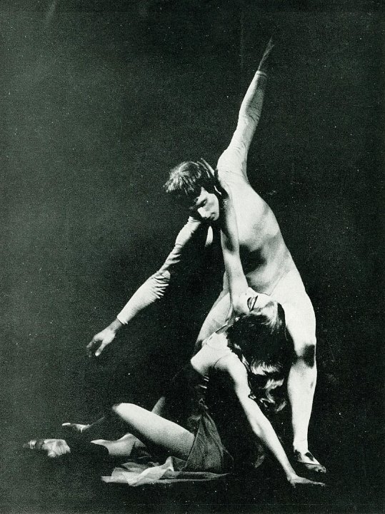 1. Der Vorhang hebt sich. 12 Takte (très animé) – sinnlicher Tanz der Nymphen. Sie rufen die jungen Leute. Diese kommen aus den Kulissen herunter