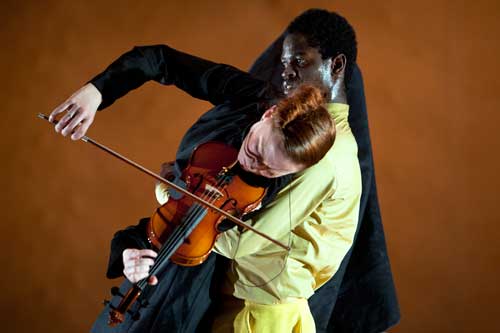 Flüsternd, respektvoll-neugierig nähern sich zu Beginn barfuss die von Beate Bormannin fantasievoll nach Mozarts und heutiger Zeit gekleideten Tänzer den Musikern auf der Bühne: Abwartend-zärtlich geschieht ein erster Kontakt, schmiegt sich der Tanz an die Geige, berühren einander zwei Künste, zwei Menschen. Dieses neugierige Entdecken der Geheimnisse des anderen geschieht in der Folge bis zum finalen g-Moll-Quartett für Klavier und Streicher immer forscher, rascher und virtuoser, in verschiedenen Formationen, auch der mitunter akrobatisch agierenden Musiker (eine Klasse für sich: Geigerin Carolin Widmann!).
