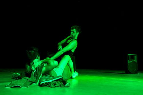 Aber vielleicht ist in diesem Fall die Droge ja Liebe, denn gegen Halbzeit der 60-Minuten-Performance beginnen die beiden einander zu küssen und schlussendlich die Kleider vom Leib zu reißen. Waren vorher nur vereinzelt helle Lichtflecken eines Suchscheinwerfers im Raum, so färben sich diese jetzt, da es „heißer hergeht“, in magisches Grün (Licht: Jan Fedinger). Auch akustisch wird mit einer ersten Rhythmusveränderung und flockigeren Love-Beats nachgeholfen. Der finale Liebes-Erguss findet seine überdeutliche Entsprechung in zahlreichen weißen Luftballons, die nach einem ausladenden darstellerischen und akustischen „Höhepunkt“ vom Schnürboden schweben. Fragen bleiben. Eine vor allem: Wie konkret muss Tanz sein?