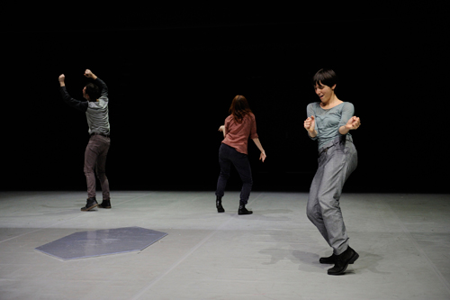 Unter dem grauen Gaze-Streifen wurde die Bühne mit einem weißen Tanzboden-Quadrat ausgelegt. Die Umgrenzung des Quadrats bildet ein dunkler Streifen, in den die TänzerInnen aus der Szenerie ins Off entweichen, wenn eine ihrer Episoden beendet ist. Wenn eine Parallelhandlung im Heute stattfindet, laufen die Bewegungen „flüssig“ ab, ohne Lücken in der Erinnerung und Verkürzungen durch das Gedächtnis oder durch die Erzählung. Die Arbeit der griechischen Choreografin ist inspiriert von Homers Odyssee, von einer Episode, in der der König im Reich der Toten weilt, wo Raum und Zeit bedeutungslos werden. Dieses Entweichen in ein zeitliches Vakuum zeigt die Choreografin durch die fragmentarische, in sich gebrochene Darstellung.