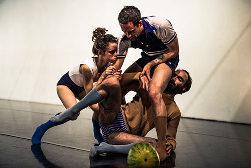 Da wir, die ZuschauerInnen, aber nicht sehen können, was im Gehirn der PerformerInnen vorgeht, ist es schwierig, diese Erkenntnisse auf der Bühne zu zeigen und im Zuschauerraum nachzuvollziehen. Wir sehen also den phänomenalen Raul Maia wie er lautloses Karaoke mimend „Over the Rainbow“ singt. Zu Herzen gehend und amüsant. Was er fühlt ist jedoch sicher nicht das, was ich fühle. Er ist Darsteller, ich bin Zuschauerin. Michael O’Connor hechelt, schwänzelt und bellt. Schließlich hat er mit der Company „a waiting dog“ 2006 das Solo „waiting dog“ produziert. Dann kommen offensichtlich die Spiegelneuronen ins Spiel. Ziemlich grausam: Pauer holt eine Melone aus dem Kübel, hält sie ziemlich lange mimik- und bewegungslos ins Publikum. Die beiden Männer lehnen während dessen an der blendend weißen Wand des Studios. Doch dann beginnt die Performerin mit dem Kürbiskopf zu spielen, ihn auf den Armen zu balancieren, zu heben und zu senken. Da wird auch Maias Kopf zum Kürbis, herumgezerrt, aufgehoben, niedergedrückt. Die Bilder gleichen sich: Hier das empfindungslose Gemüse, dort der möglicherweise leidende menschliche Kopf.