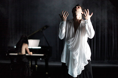 Der großartige van Rooij antwortet in Buto-Manier vor allem mit den Armen und dem Oberkörper auf die hämmernden Rhythmen des Klaviers. Die Pianisten Tomoko Mukaiyama ist nicht nur Virtuosin am Instrument sondern auch Performerin. Ganz in Schwarz mit nacktem Oberkörper, die Brüste jedoch vom langen schwarzen Haar bedeckt, kriecht sie nahezu unsichtbar auf die finstere Bühne. Eine Hexenmeisterin auf dem Weg zu ihrem Zauberinstrumentarium. Das macht sie sich im allmählich aufdämmernden Licht untertan. Mit Armen und Fäusten bearbeitet sie die Tasten, ganz im Sinne der Russischen Komponistin Galina Ustwolskaja, deren Klaviersonaten Nr 5 und 6 Quelle und dominantes Ziel der Performance sind. Von Franz Schubert sind die leisen Töne, die den Ohren Erholung von den hämmernden dröhnenden Rhythmen gönnen. Van Rooij ist jedenfalls ganz im Einklang damit, gibt sich, ebenfalls schwarz gekleidet, den Kontrasten hin, taucht vom Licht ins Dunkel, bis er sich im weißen Hemd präsentiert und die Pianistin von ihrer Schwerarbeit am Instrument erlöst. Im Slow-Motion-Pas de deux wird die Stimmung friedlich, nur das Rascheln der herabfallenden Blätter (Käfer? Oder doch nur Papierschnitzel?) ist zu hören. In gemessener Langsamkeit hüllen Mann und Frau gemeinsam das schwarze Klavier in weiße Leinentücher, Leichentücher. Ein perfekter weißer Sarg. Für Galina Ustwohlskaja? Die berühmte Komponistin ist 2006 in St. Petersburg 87jährig verstorben.
