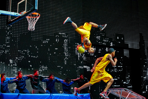 Sobald es losgeht, ist die deprimierende Architektur jedoch schnell vergessen, unter anderem aufgrund der 5-köpfigen Acrodunk-Formation. Diese US-amerikanischen Nachfahren einstiger Sklaven begeistern mit einer rasanten Basketball-Nummer. Immer wieder nehmen sie Anlauf, springen auf ein Trampolin, lassen sich hoch in die Luft schleudern und werfen den Ball nach virtuosen Salti zielgenau in den Korb. Auch an Humor fehlt es den fulminanten Springginkerln nicht. Zwischendurch katapultiert sich ein Spieler selbst ins Netz.