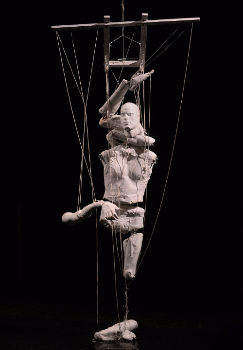 Und von diesen war im Gegensatz dazu viel zu erleben in „Nie wieder Friede“ (nach Ernst Toller): Helga Lázár (1993, Ungarn), die hier für Konzept und Regie verantwortlich zeichnet, ist Puppenspielerin, Figurentheaterregisseurin, Bühnenbildnerin. Sie experimentiert im Grenzbereich von Körper- und Materialtheater, wo auch dieses „groteske Endzeit-Varieté“ mit temporeicher Kreativität angesiedelt ist.