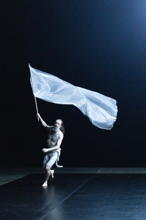 In „Tribute to Kurt Jooss‘ ‚Green Table‘“ reduziert der rumänische Choreograf Manuel Pelmus das für den zeitgenössischen Tanz einschneidende, 1932 uraufgeführte Antikriegs-Werk auf (wie ursprünglich konzipiert) ein Solo in lediglich zwei Bildern. Ist das auf den Kern reduzierte Anprangern nutzlosen Tuns ein Tribut an die noch größer gewordene Tatsache der Hilflosigkeit gegenüber der Macht von Kriegen? Frédéric Gies (Frankreich) redet und gestikuliert sich in Anzug und Krawatte ‚unendlich‘ lang den Mund wund – ohne Stimme. Wird doch solches, ein Reden gegen den Krieg (wie anzunehmen ist) ohnehin nicht (mehr) oder kaum gehört. Gieß‘ auch in der Mimik vielsprechende Ausdrucksstärke manifestiert sich nachhaltig als das Aufzeigen nichtssagender Versuche verzweifelter Beschönigung. Verstärkt im zweiten Bild, wenn er Runde um Runde eine große weiße Fahne wunderschön schwenkt. Resignation pur, aber in der geradlinigen, minimalistischen Bildsprache eben sehr wohl aufrüttelnd.