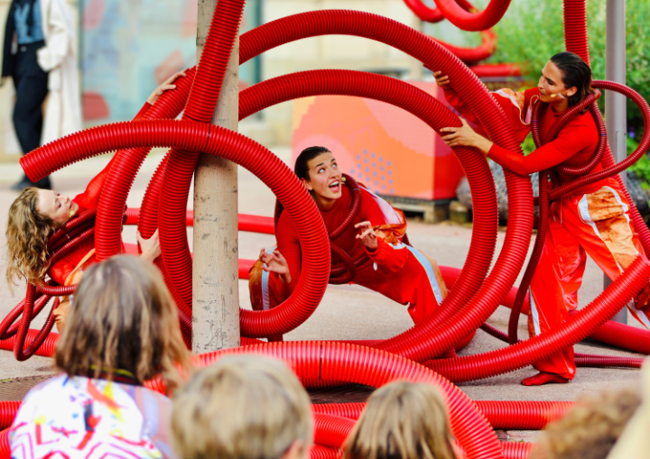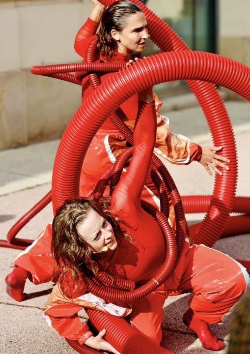 Die immer noch aufgeregte Taube führt das Publikum zur Krake, denn als solche entpuppt sich das rote Etwas, das unbeweglich auf dem kalten Betonboden wie ein riesiger verwahrloster Gartenschlauch liegt . Ein freundliches Sitzrund lädt drumherum zum Verweilen ein. Währenddessen die Taube ohne Unterlass und kaum luftholend den Oktopus (lat. für Krake) erklärt, wird dieser langsam lebendig.Krake2