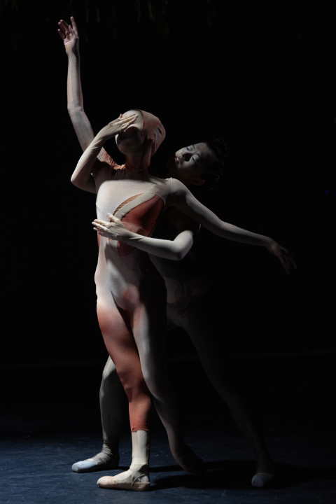 Auch die Texte für die Libretti der vier Teile wurden von unterschiedlichen Autor*innen geschrieben. Sie alle sind von den brennendsten Fragen unserer Zeit getrieben: Wie wird die technologische Entwicklung unsere Welt verändern? Wie die Klimakrise? Wie bauen wir Berührung und Beziehungen auf, wenn wir uns doch zunehmend isolieren? Wie wird das Verhältnis von Robotern und Menschen zueinander sein? In seiner Choreografie wagt sich Binet auf den feinen Grad zwischen menschlicher Realität und einer Welt der künstlichen Intelligenz. Emotionen werden auf eine Ebene gehoben, auf der sie nicht mehr unmittelbar gelesen werden können. Die Künstlichkeit der klassischen Tanzsprache leistet dieser Ambivalenz Vorschub und wird von Binet geschickt eingesetzt. Die zwölf jungen Tänzer*innen setzen diese mit überwiegend emotionsloser Mimik und einwandfreier Technik um. Die löchrigen Kostüme von Thomas Tait suggerieren eine dystopische Verortung – nicht alle Aussparungen in den Trikots wirken sich vorteilhaft auf die Figur der Tänzer*innen aus –, die von den stellenweise eingesetzten Spiegeln episch-cineastisch (Bühne: Shizuka Hariu) überhöht wird.