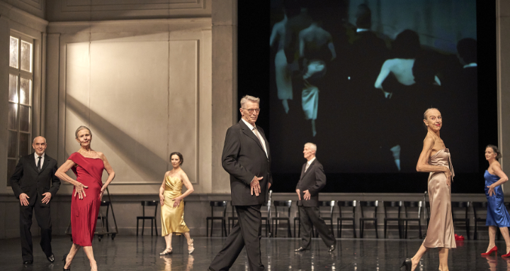 Der Bühnenraum ist ein Palimpsest: Von den ursprünglich 20 Mitwirkenden sind neun der legendären Tänzer*innen (neben Tankard sind das Elisabeth Clarke, Josephine Ann Endicott, Lutz Förster, John Giffin, Ed Kortlandt, Beatrice Libonati, Anne Martin, und Arthur Rosenfeld) auf der Bühne. Auch in Abwesenheit bleiben die anderen ihre (nun imaginären) Partner*innen. Über ihnen flimmern Projektionen des Films der Uraufführung von Rolf Borzik wie Schatten aus der Vergangenheit: junge Körper, fließend, verführerisch, roh. Darunter die gealterten Körper als Gegenstimmen, die mit einer Vergangenheit tanzen, die bis heute noch leuchtet. Kontakthof5