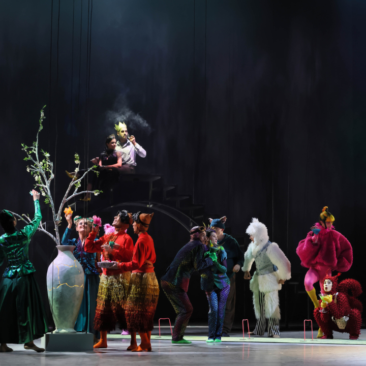 Kulissen und Mobiliar-Requisiten hängen ästhetisch gefällig wie im Marionettentheater an Fäden herab. Dank des mobilen Bühnensets (Kaspar Glarner, Simon Schabert) können Ortswechsel vor den Augen der Zuschauer enorm schnell stattfinden. Die von Bregje van Balen im Stil von zu Leben erwachten Kinderbuchillustrationen eingekleideten Hauptprotagonisten mit ihren zahlreichen tierischen Begleitern begegnen sich in einer selig-entspannten Gedankenwelt. Jene Herausforderungen, die zu Hause im Palast respektive dem stiefmütterlichen Haushalt mit den zwei nervigen, auf Zank gebürsteten Stiefschwestern auf sie einwirken, spielen da keine Rolle mehr.