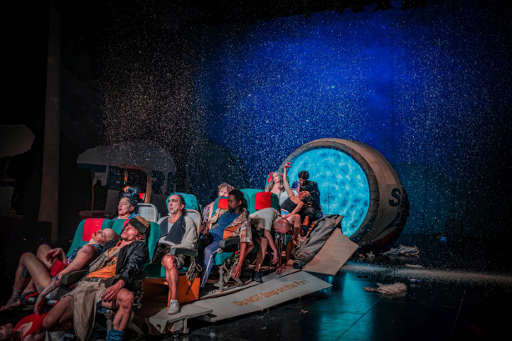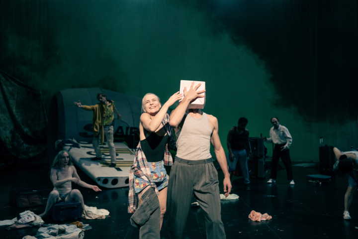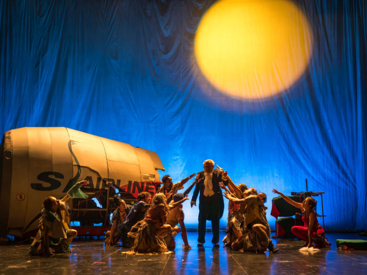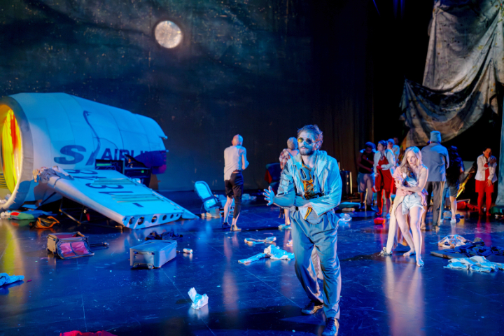 Nach einer Bruchlandung werden er und seine Ko-Passagiere aus dem Flieger geworfen, purzeln aus den Zuschauerreihen auf die Bühne und finden sich verstreut in einer hochalpinen Umgebung wieder. Der Donauwalzer erklingt in einer Verschränkung mit Ennio Morricones "Spiel mir das Lied vom Tod". Damit ist die Szene für das Geschehen in den folgenden 100 Minuten gesetzt, das sich zwischen (fiktiven, historischen und aktuellen) Referenzen entfaltet und in seiner Absurdität ein Abbild unserer heutigen Realität sein könnte.