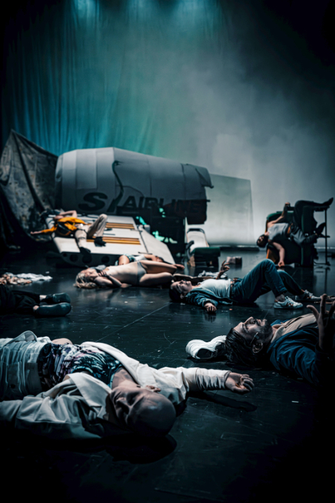 Das Flugzeug ist in mehrere Teile zerbrochen. Die Mitglieder des Strauß-Orchesters sind von der unsanften Landung arg malträtiert worden. Waren sie vorher noch grantige, aber unversehrte Passagiere, irren sie nun wie Zombies an der Grenze zwischen Leben und Tod herum.