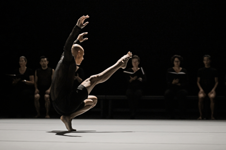 Eröffnet wurde der Abend mit einem Ausschnitt aus „Force Majeur“ von David Raymond und Tiffany Tregarthen. Gezeigt wurde ein lyrisch-poetisches Stück mit weichen Bewegungen zu den sanft neoklassischen Klavierklängen von Angèle David-Guillou. Eine Verbindung zur titelgebenden „höheren Gewalt“ war dabei nicht auszumachen. Etwas irritierend wirkte hier, wie so oft, die düstere Lichtstimmung, in der die großteils schwarzen Kostüme mit dem schwarzen Hintergrund verschwammen.
